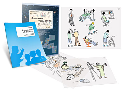Комплект представляет собой рисунки, иллюстрирующие те или иные языковые явления. С помощью таких рисунков совершенствуются умения в области морфологии, орфографии, словообразования и культуры речи, а также отрабатываются синтаксические и пунктуационные умения по темам, изучающимся в 8–9 классах.