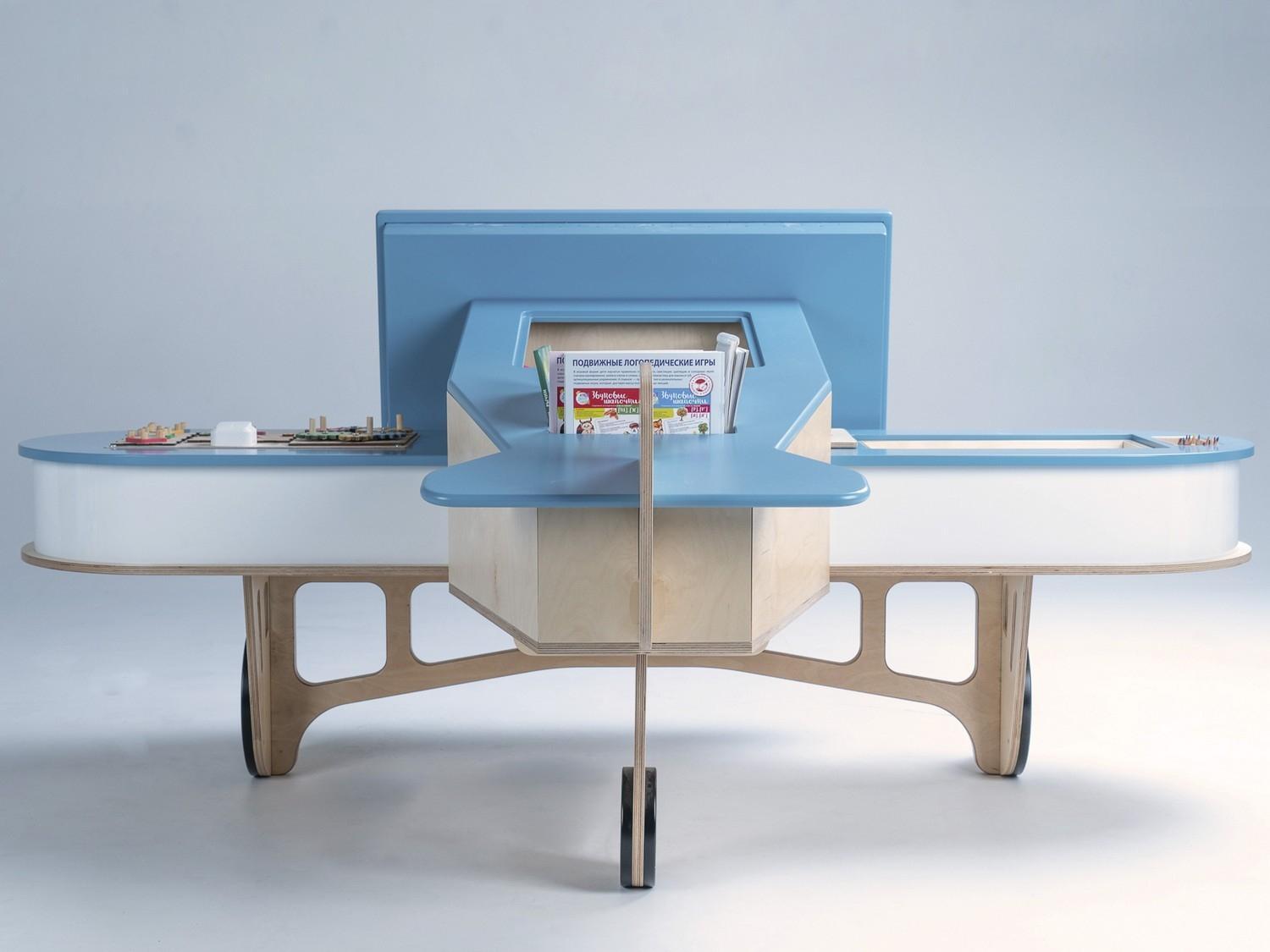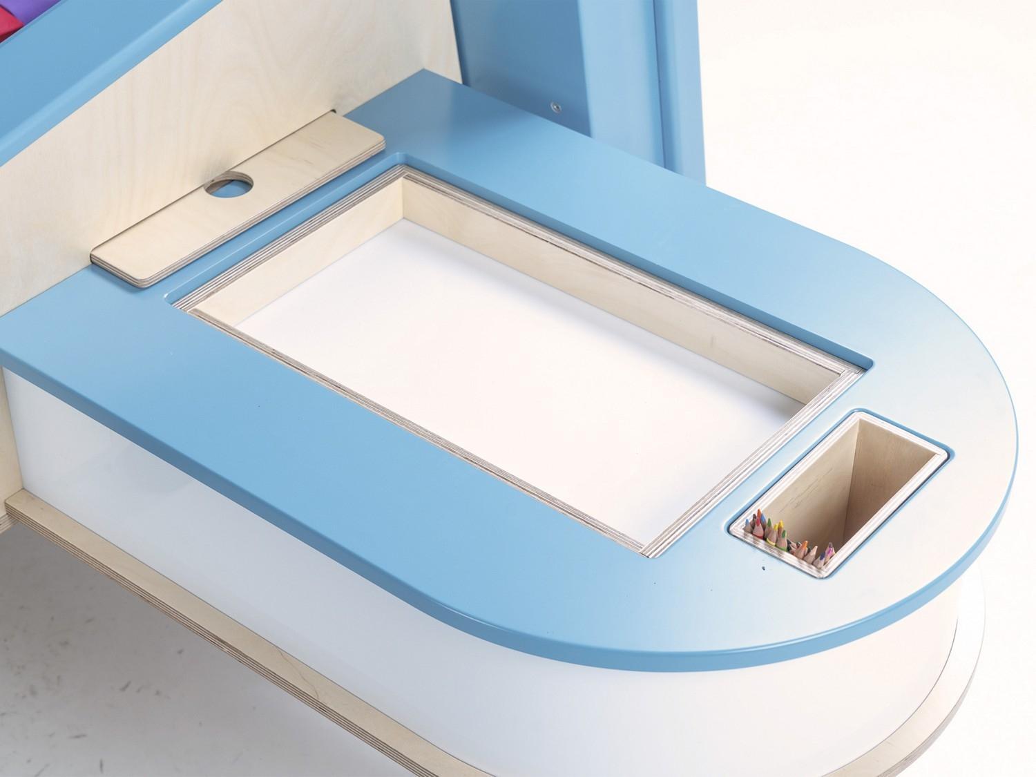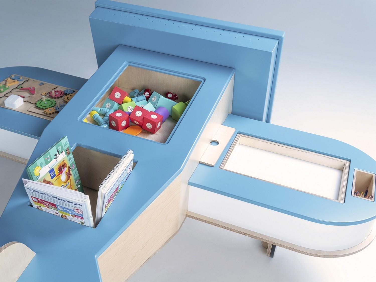 На правом крыле самолёта расположен световой стол для рисования песком. Песочная панель закрывается крышкой, становясь полноценной рабочей зоной для детей.