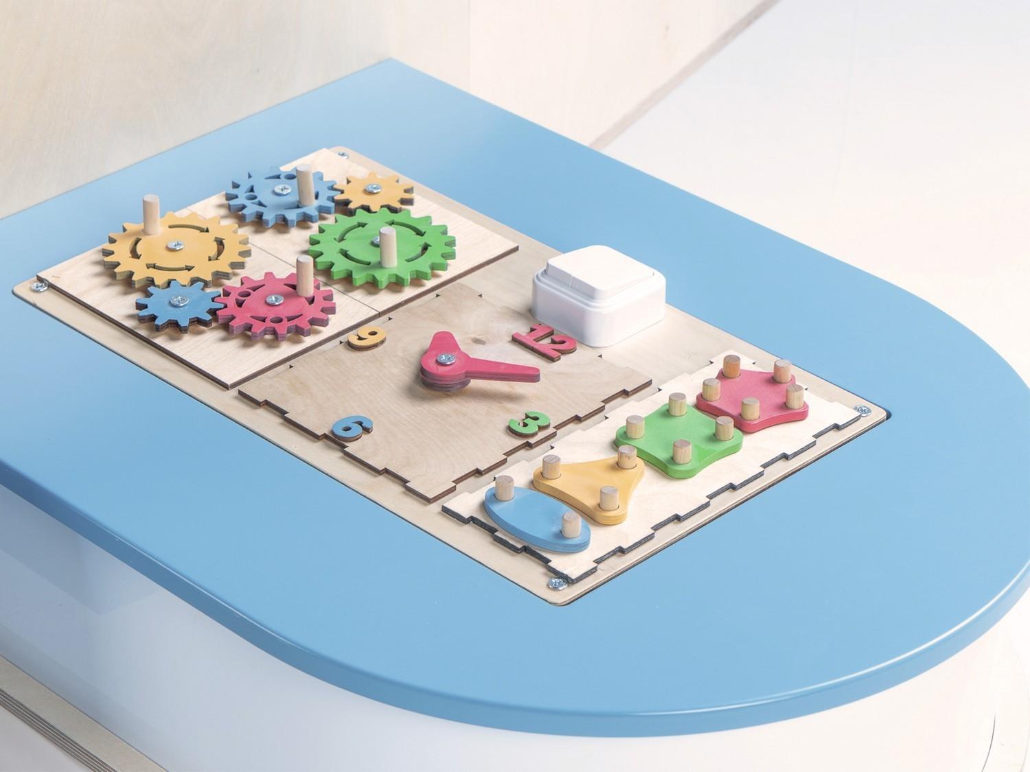 На левом крыле МИК «Самолёт» установлено тактильное панно Монтессори. Развивает мелкую моторику и логику, позволяет безопасно научиться пользоваться предметами быта.