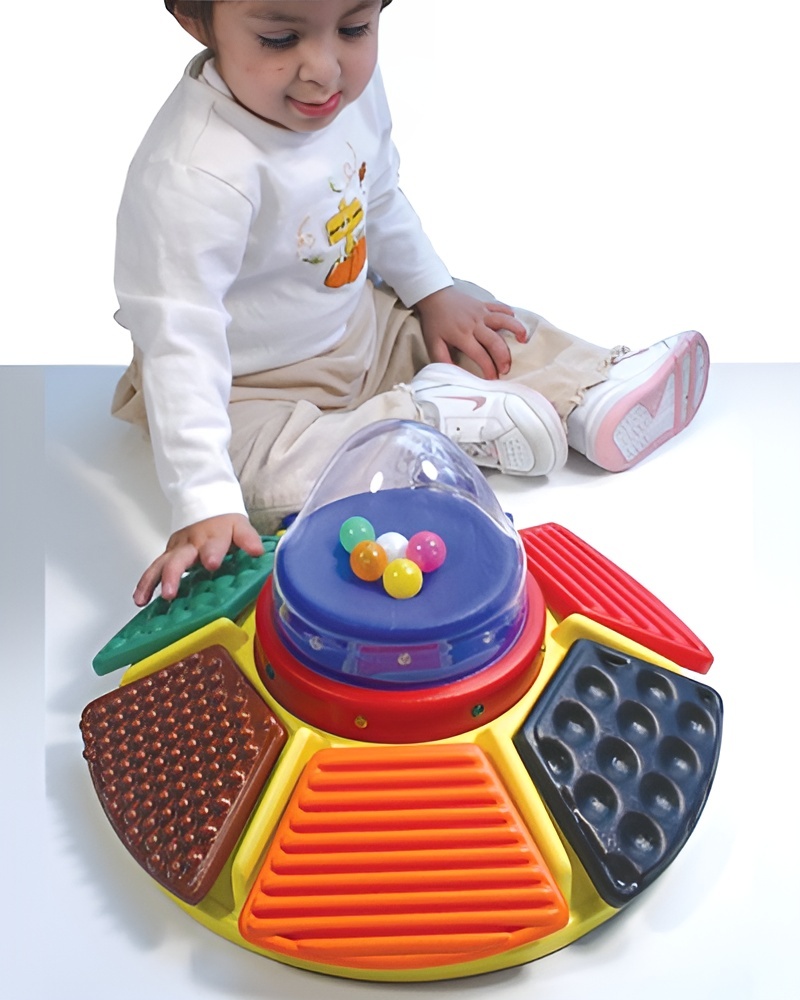Данная игра разделена на 6 больших тактильных клавиш разной текстуры и разных цветов. При нажатии на данные клавиши ребенок получает различные тактильные, визуальные и слуховые ощущения – вибрация, несколько различных мелодий, треск шариков, разноцветные огни. Карусель можно вращать по кругу.