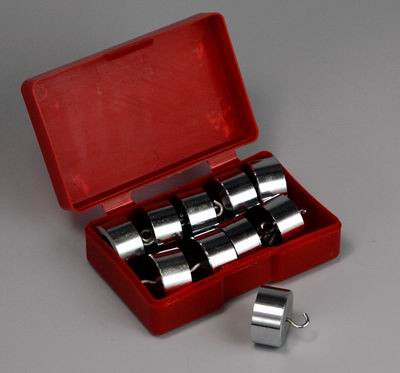 Набор состоит из 10 металлических грузов цилиндрической формы массой по 50 г каждый. Все грузы имеют по два крючка и указание массы.