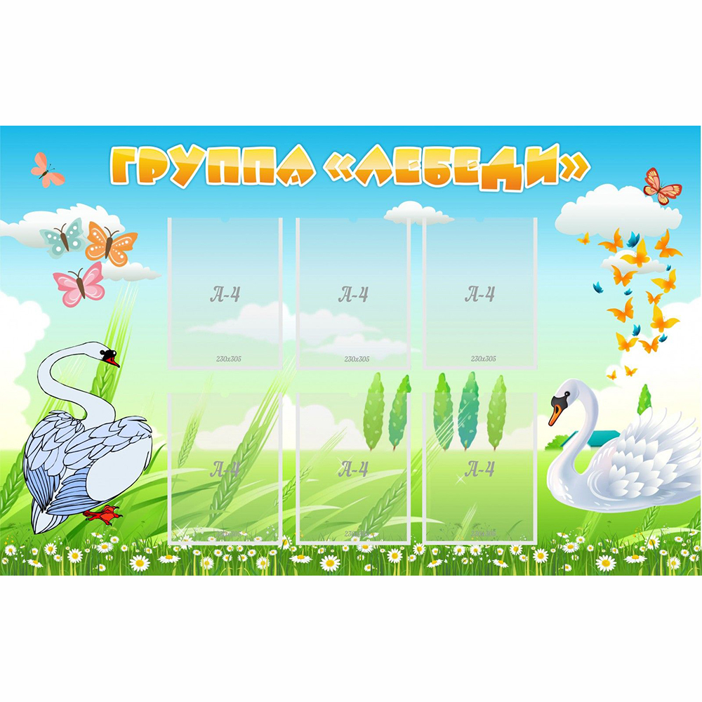 Грациозные белые птицы на фоне летнего пейзажа, множество разноцветных бабочек и яркие буквы названия стенда в белой окантовке - всё это не может остаться незамеченным детьми и их родителями. А в шести удобных карманах формата А4можно разместить списки детей, имена и контактные данные воспитателей, правила поведения или другую полезную информацию для родителей.