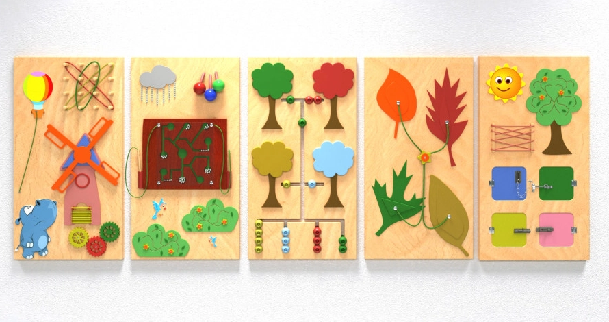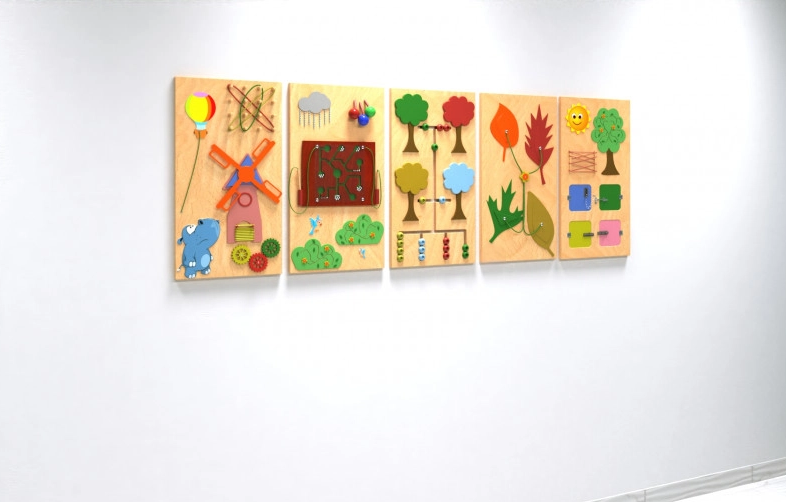 Набор настенных панелей представленного модели выполнена из дерева, основание окрашено в нейтральный цвет светлой древесины, а развивающие детали и приспособления выделяются яркими акцентами.