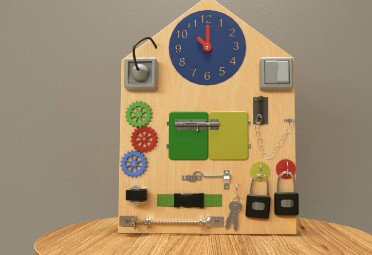 Бизиборд на тему я сам — это игровой модуль для раннего детского развития. Состоит из плоской деревянной основы. на которой закреплены различные приспособления для увлекательной игры. Производитель позаботился о том, чтобы все элементы и детали бизиборда были абсолютно безопасны в использовании даже самыми маленькими детками.