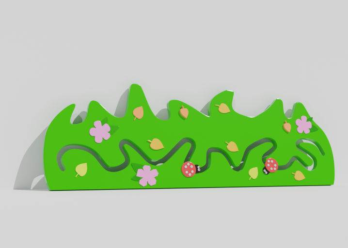 Выполнена из безопасных и прочных материалов в виде травки, на которой расположены цветные элементы: цветочки, насекомые, листочки. Панель выполняет функцию не только украшения детской комнаты, но и развивает детское воображение, мелкую моторику, логику, учит различать цвета.