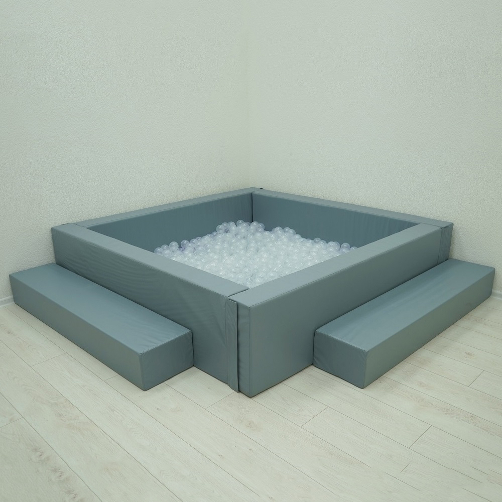 Мягкий квадратный манеж, наполненный прозрачными шариками. Предназначен для детских комнат в ДОУ, а также для оснащения сенсорных комнат и кабинетов детских психологов.