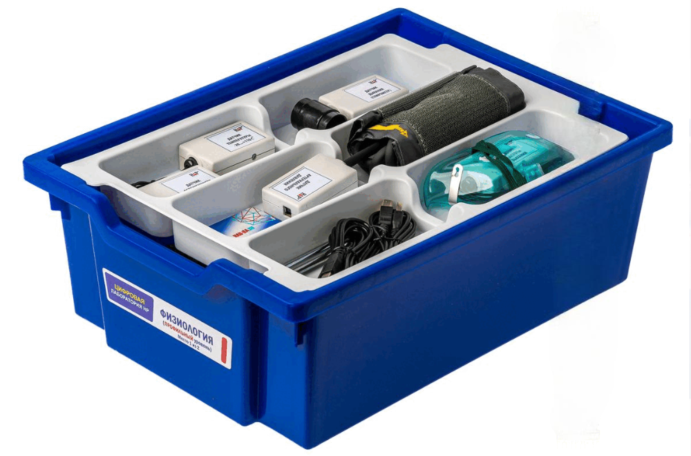 Цифровая лаборатория укомплектована в пластиковую систему хранения, которая закрывается прозрачной пластиковой крышкой на защелках для обеспечения наблюдения за содержимым. Комплект оборудования и датчики в системе хранения располагается на ложементах.