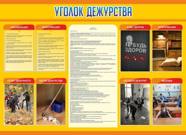 Такой важный и полезный стенд должен быть в коридоре каждой школы, чтобы приучить детей к ответственности и к дисциплине. На стенде имеются 8 карманов, чтобы разместить всю необходимую информацию о дежурствах. Каждый карман имеет свое название – отчет дежурного, информация о дежурстве, план дежурства и многое другое. По середине стенда имеется большой вертикальный текст с необходимой информацией о том, как важна система дежурств в школе. Так же в описании имеется раздел об обязанностях дежурного и о том, как и зачем необходимо составлять отчет о выполненной работе. Такой стенд, несмотря на свой большой размер, имеет очень легкий вес.