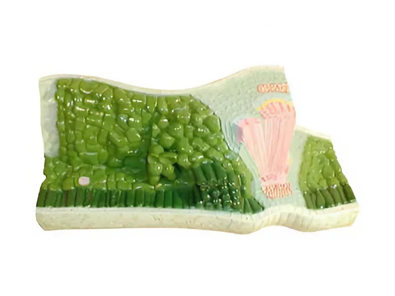 На модели выделены цветом следующие детали составного листа: кожица, палисадный мезофилл, рыхлый мезофилл, устьица, сосуды, волокна, ситовидные трубки