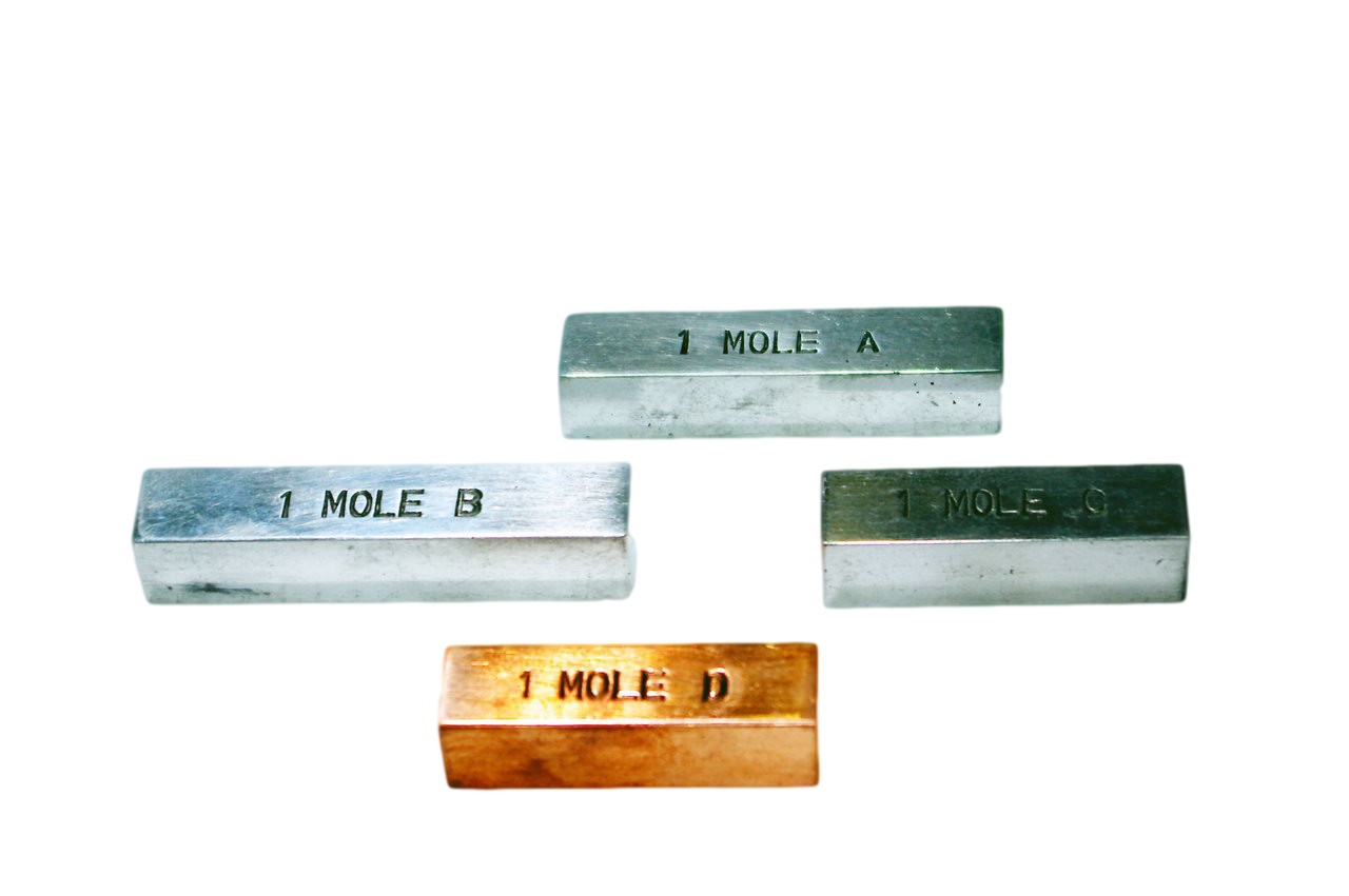 Комплект содержит набор из четырех образцов элементов: железа, меди, цинка и алюминия. Каждый образец содержит один моль вещества. Разделив количество граммов этого образца на его атомную массу, вы получите